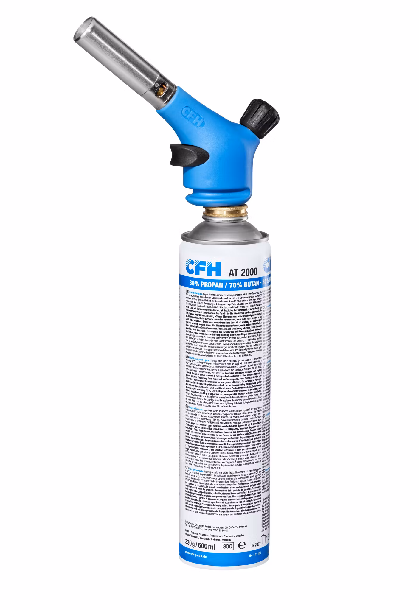 Brännarset innehållande brännarhandtag med piezotändning och mixgasflaska.