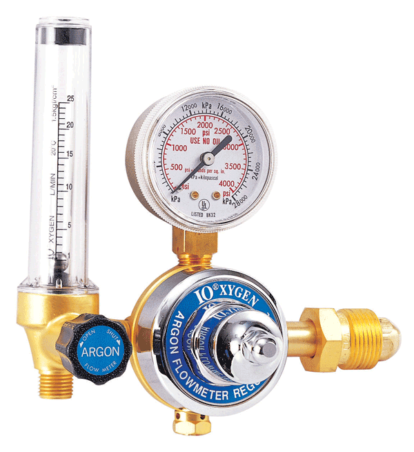 Reducerventil för Argon och Argonmix CO2 med flödesmätarrör för exakt avläsning av gasflödet.
