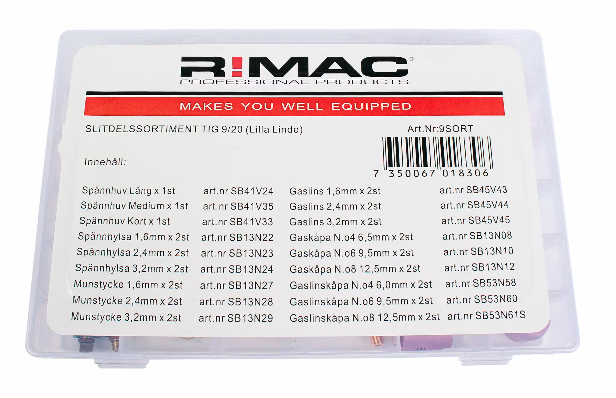 Slitdelssortiment 9/20 (lilla Linde) Slitdelssortiment innehåller: Artikel Benämning st 13N22 Spännhylsa 1/16" ( 1.6MM ) 2 13N23 Spännhyl